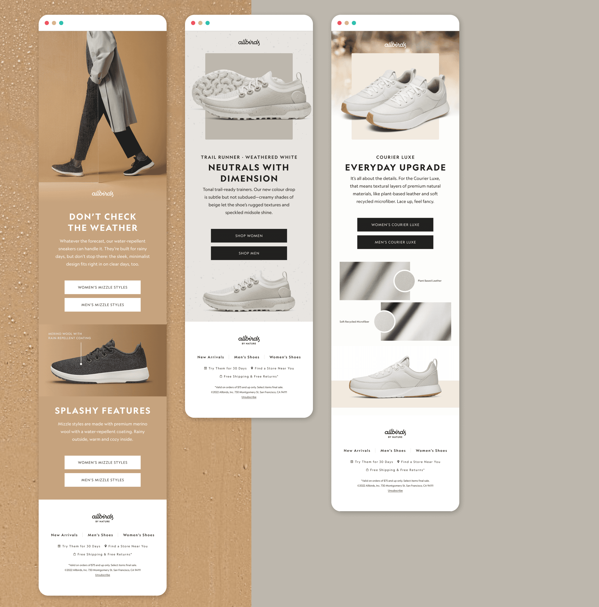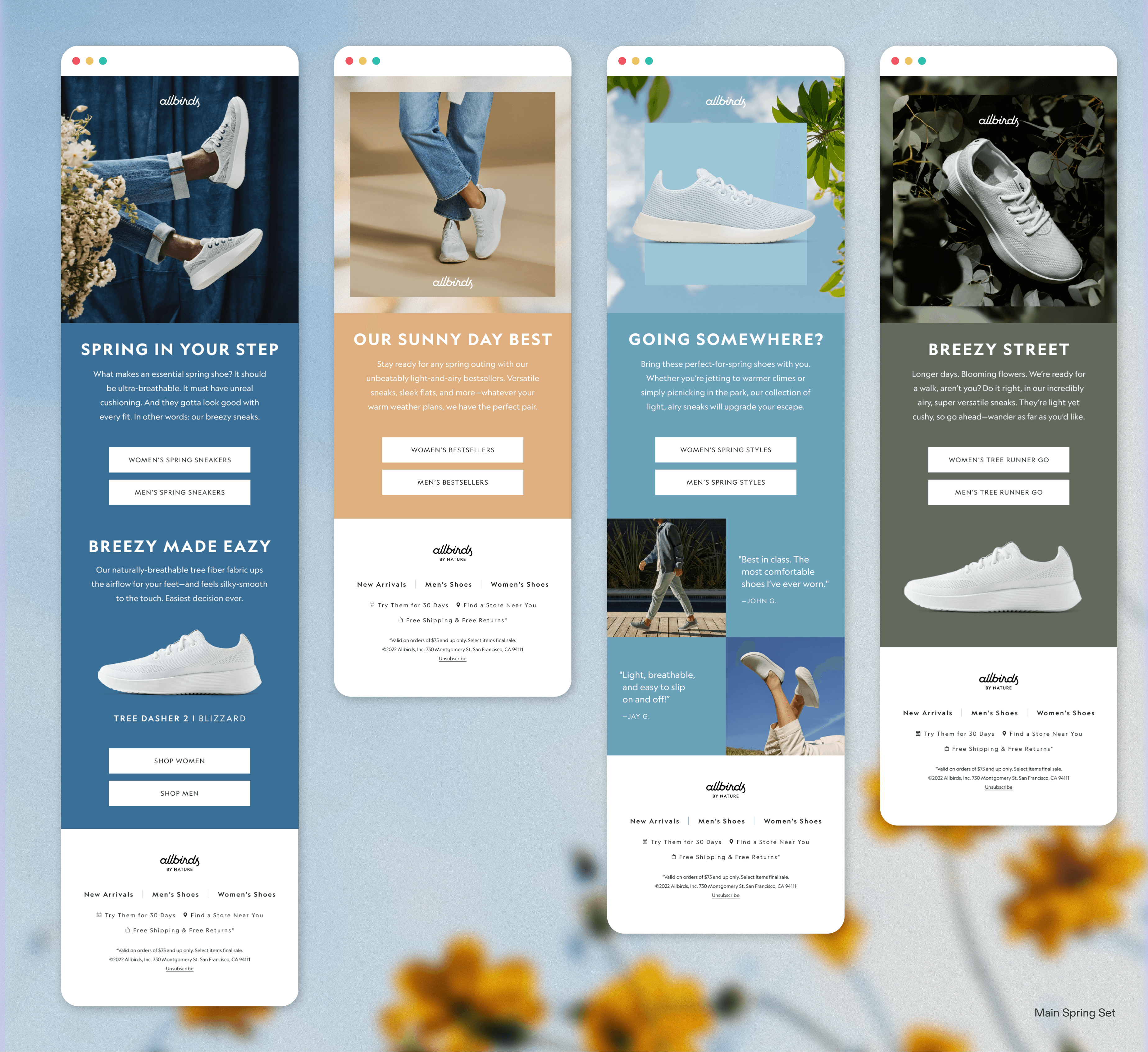 A set of emails were asked to be created to highlight spring seasonal product. Utilizing evergreen, past spring shoots, and product shots I curated a spring feel to the non-campaign specific deliverables.