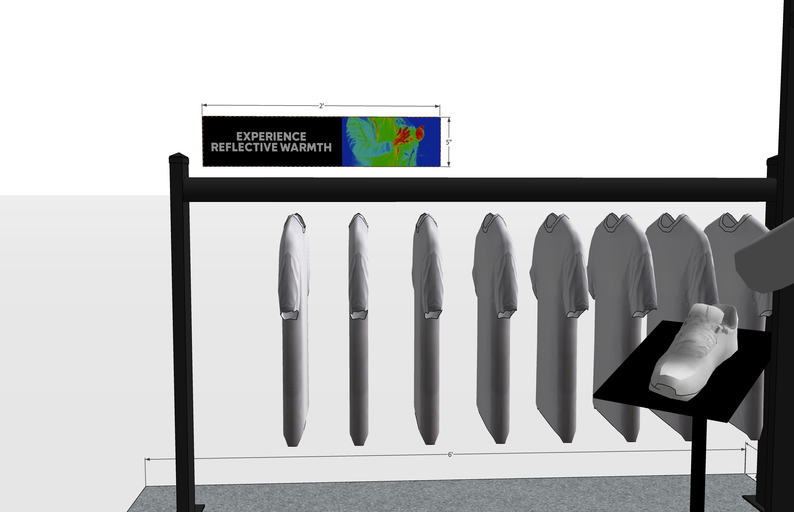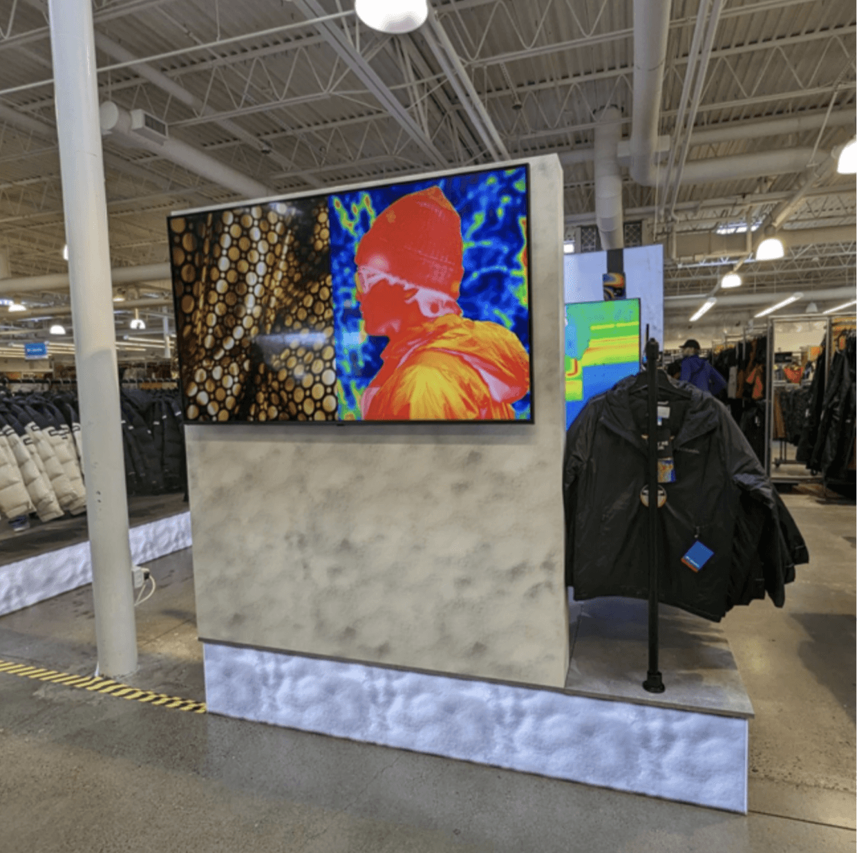 The final layout consisted of longer racks to hold more product, initially a projector was going to be used with the heat camera but due to store lighting we swapped for a large 77” tv which ended up feeling like the better option.
