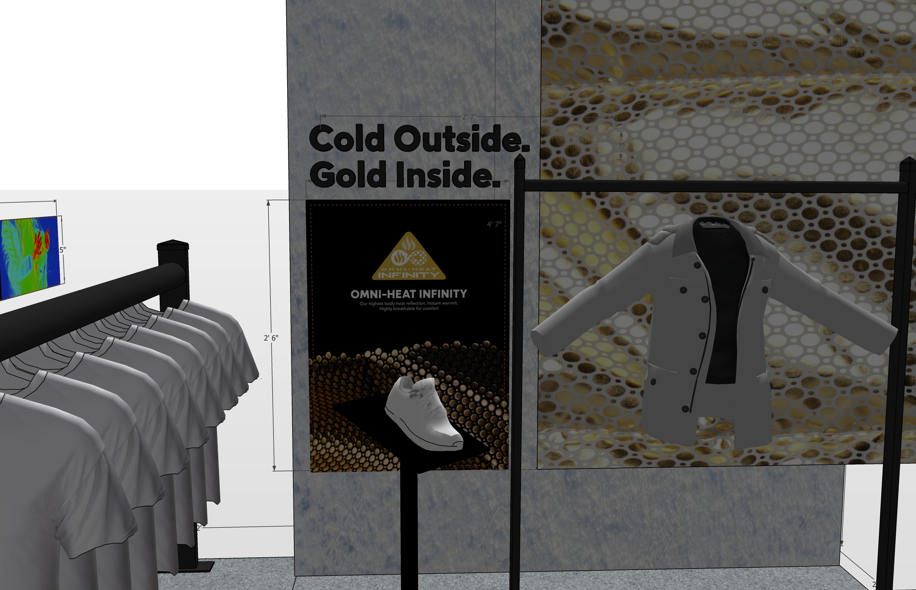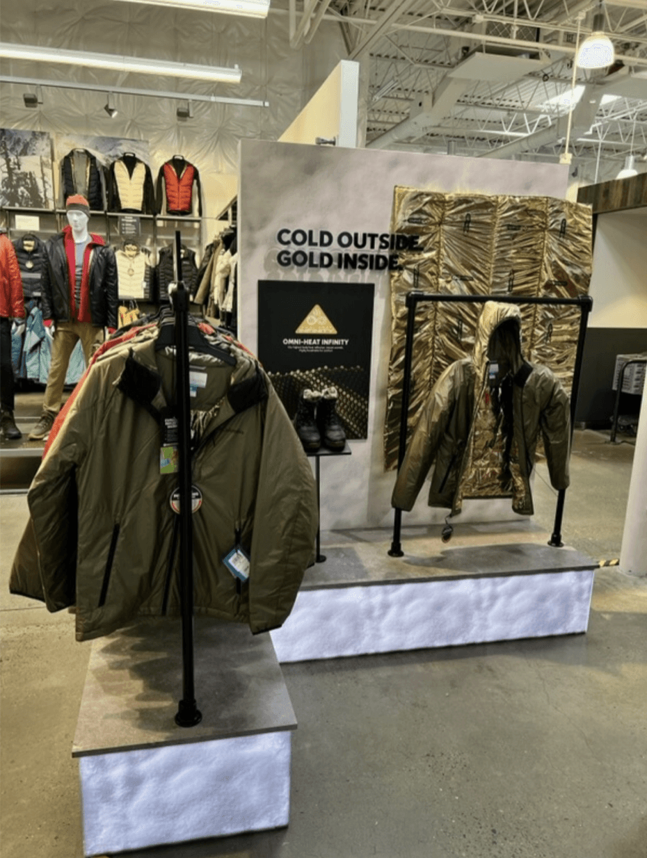 Omni-Heat fabric backers were added using actual jacket fabric so costumers could interact with the material and add a pop of gold color to the experience.