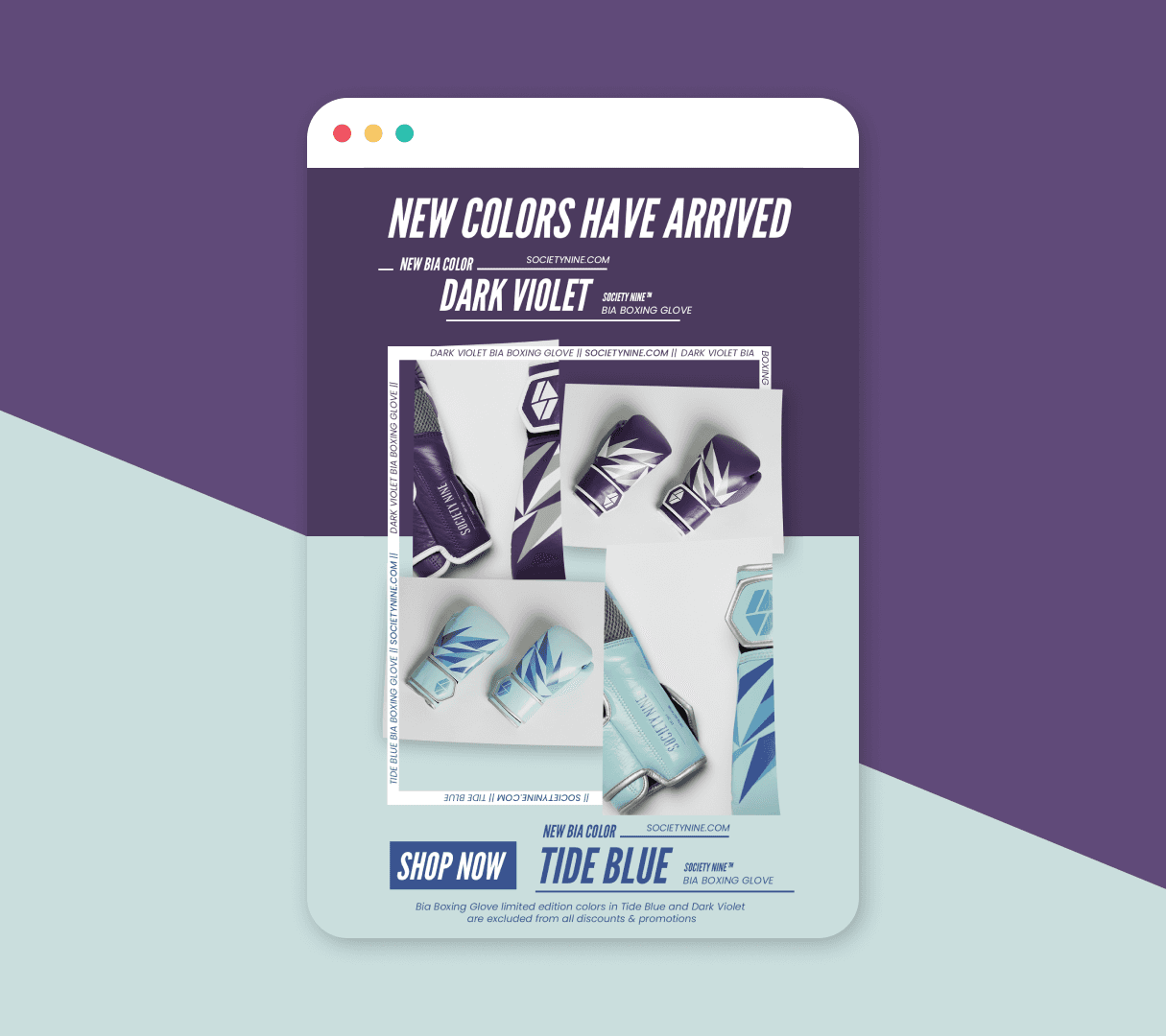 New limited edition Bia boxing glove colors were going to drop so a quick email and social campaign was needed. My goal with this digital launch was to highlight the colors. The Society Nine brand already had a reputation for quality so I felt letting that live in the brand name was enough and could focus on more visual aspects.